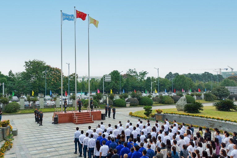 上午8:30分清晨的陽光灑在公司廣場(chǎng)上,伴隨著晨風(fēng)的拂過,國(guó)旗緩緩升起,紅色的旗幟在藍(lán)天中熠熠生輝。集團(tuán)董事長(zhǎng)謝世千帶領(lǐng)集團(tuán)中高層管理人員和100余名職工代表整齊而莊嚴(yán)地站在國(guó)旗下,面向國(guó)旗,唱響國(guó)歌,仰望著冉冉升起的國(guó)旗。