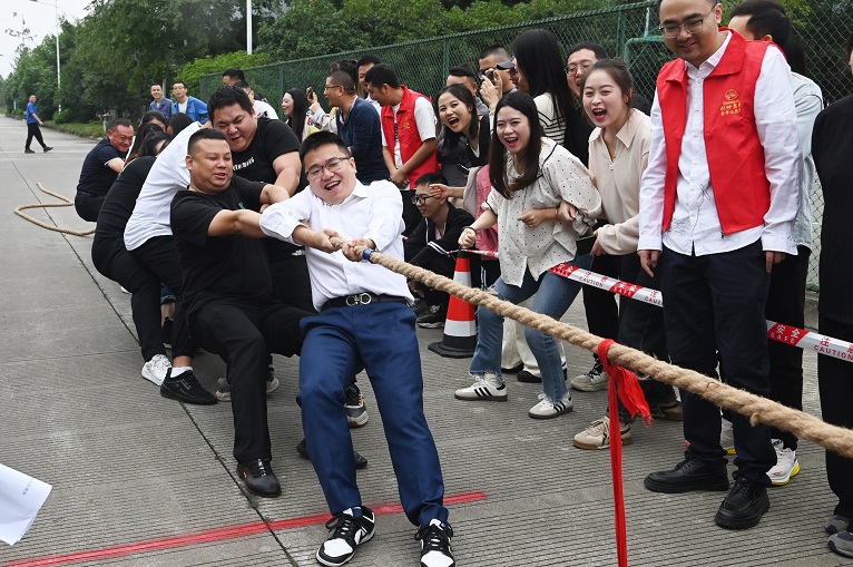 9:00,趣味運(yùn)動(dòng)會(huì)在集團(tuán)總裁謝澤波宣布正式開始中拉開帷幕,7支隊(duì)伍匯聚在比賽場(chǎng)地,肌肉賁張,目光堅(jiān)定,汗水和壯志交織。當(dāng)裁判一聲令下,繩索緊繃,地面震動(dòng),隊(duì)員們?nèi)缑瞳F般拼命地拉扯,拔河繩上傳來激烈的摩擦聲,空氣中彌漫著緊張的氛圍。觀眾席上的吶喊聲與助威聲震耳欲聾,互不相讓,每一刻都充滿了激情和決心。經(jīng)過多輪角逐鑫坤葉片代表隊(duì)以力拔山兮之勢(shì)奪得冠軍。